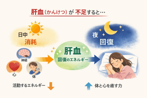 ここでいう「肝血」は、実際の血液そのものではなく、心や神経、体を休ませるための漢方的な考え方です。