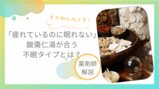 更年期 不眠に悩む更年期女性へ漢方薬の酸棗仁湯が合うタイプを薬剤師が解説 「最近、寝つきが悪い」「疲れているのに、いざ布団に入ると目がさえてしまう」更年期になると、こうした不眠の悩みが多くなります。不眠に対しては、睡眠薬という選択肢もありますが、自然由来の治療薬として、漢方薬という選択肢も注目されています。この記... 2026.01.22 更年期